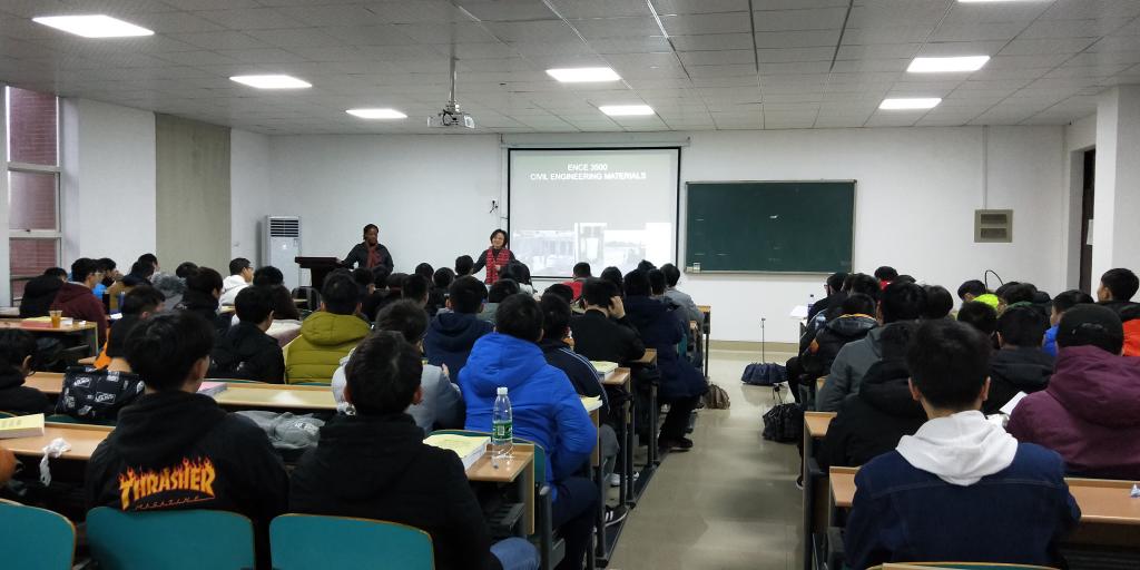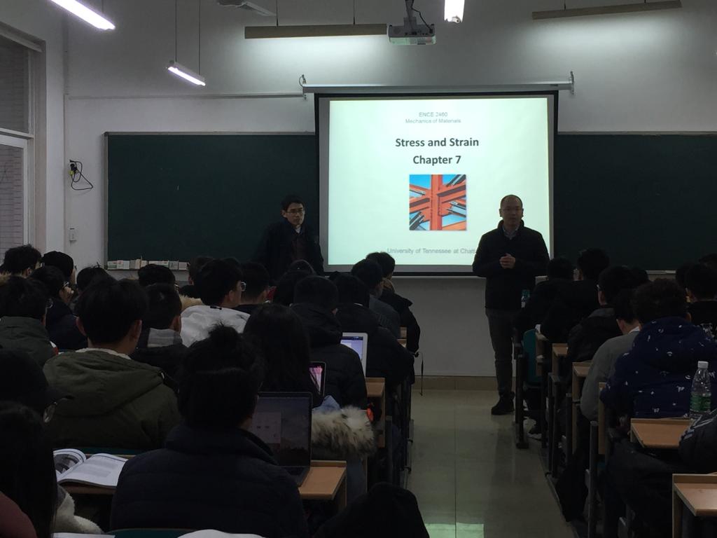 本次引进的6门课程为Foundation Analysis and Design、Transporataion II(2015级),Civil Engineering Materials、Design of Concrete Structures(2016级),Mechanics of Mateials、Dynamics(2017级),分别由美国田纳西大学诺克斯维尔分校的黄宝山教授,美国田纳西大学查塔努加分校的Fomunung Ignatius教授、Onyango Mbakisya副教授、吴卫东博士、Owino Joseph教授承担,并由雷竞技官网国际学院陈瑜,土木工程学院任宜春、潘军、曾明华、尹平保以及交通运输工程学院刘喜敏等6位老师担任引进课程助教工作。中外任课教师均表现出很强的敬业精神,克服了时差和恶劣天气的影响,精神抖擞提前到教室上课。中外合作项目同学们也展现了良好精神面貌,上课认真听讲,积极参与课堂互动。