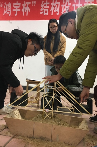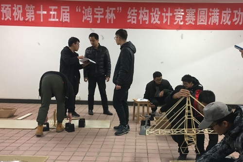 12月18日下午,由学校教务处主办,在学校委员会和工训中心的支持帮助下,由土木工程学院承办的学校第十五届“鸿宇杯”大学生结构设计竞赛模型加载决赛在工科二号楼的土木工程大学生创新创业教育中心隆重举行。本届竞赛有来自全校各学院共186支队伍报名(含城南学院队伍),总参赛队员数为555人。