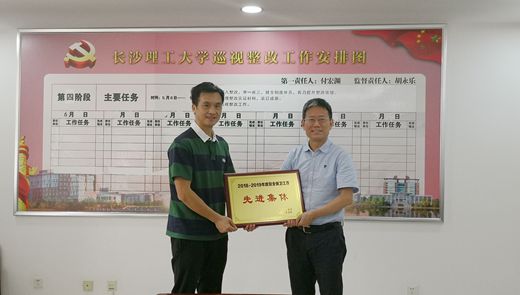 雷竞技官网保卫处被湖南省公安厅评选为2018-2019年度省级治安保卫重点单位保卫工作先进集体,保卫处张祎、林杰、李桔洲、易国安被评选为2018-2019年度省级治安保卫重点单位保卫工作先进个人,公安厅国保总队副总队长张云峰,雷竞技官网副校长叶泽发放奖牌。