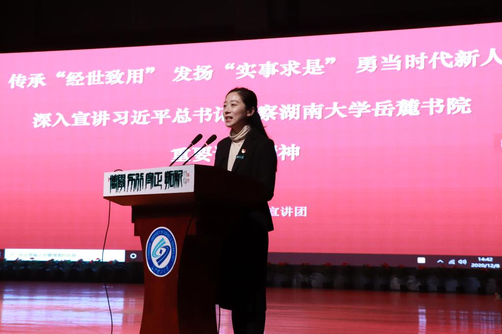为深入推进“致敬伟大中国”主题教育活动,12月8日下午,湖南大学博士理论宣讲团应邀在云塘大会堂开展报告会,宣讲主题为《传承“经世致用”,发扬“实事求是”,勇当时代新人——深入宣讲习近平总书记考察调研湖南大学岳麓书院重要讲话精神》。校特邀党建组织员边沙海、化学学院专职组织员邓豫、化学学院及能动学院学工老师,学院近500名学生代表参加。