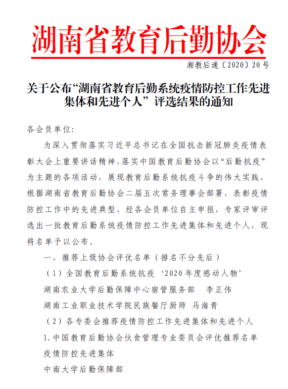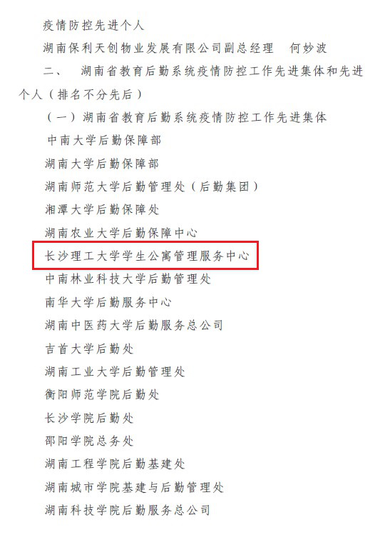 近日,在湖南省教育后勤协会组织开展的“湖南省教育后勤系统疫情防控工作先进集体和先进个人”评选中,雷竞技官网公寓中心荣获“湖南省教育后勤系统疫情防控工作先进集体”。