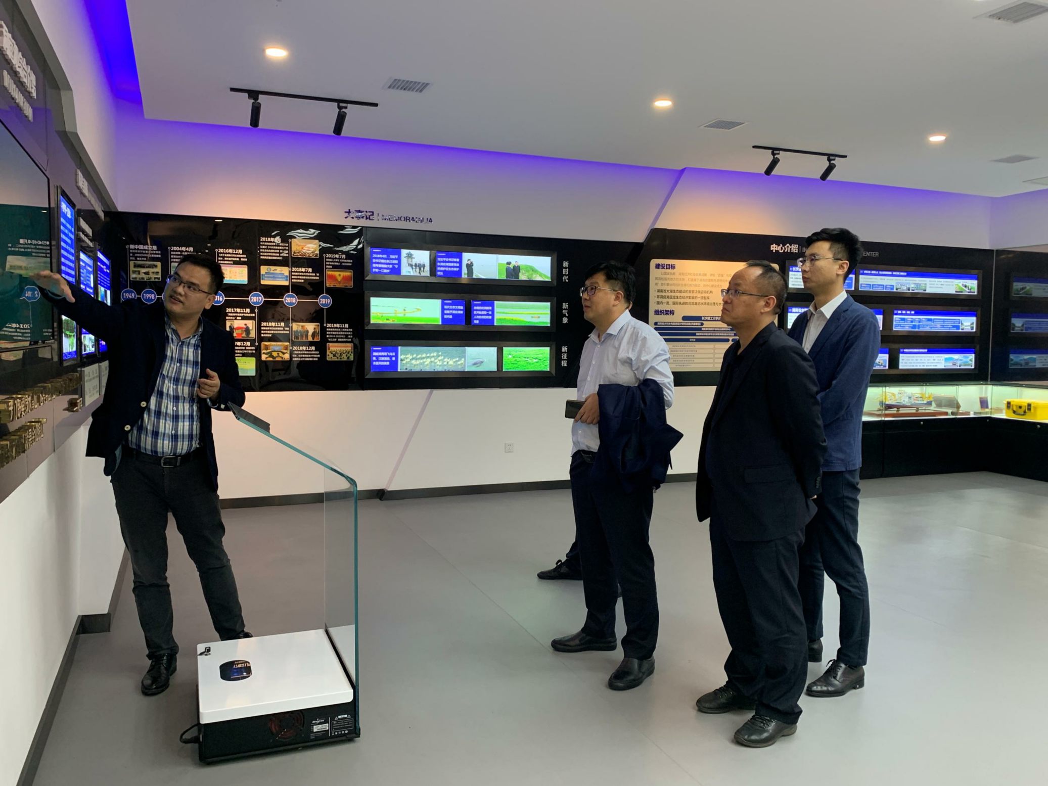 邓斌老师向王际好一行介绍了洞庭湖的概况、目前治理所面临的重点难点,以及洞庭湖实验室的建设历程、组织框架、发展目标等方面,重点介绍了智慧洞庭综合信息化平台的搭建过程及其功能模块,并对其中采砂监管等模块的实际应用情况进行了展示。