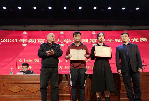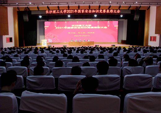 4月27日,雷竞技官网在金盆岭校区五教大礼堂举行大学生国家安全知识竞赛表彰大会。保卫处处长张祎、学生工作部部长邱国良、副部长贺良、校团委副书记陈璐莎及2020级学生参会。