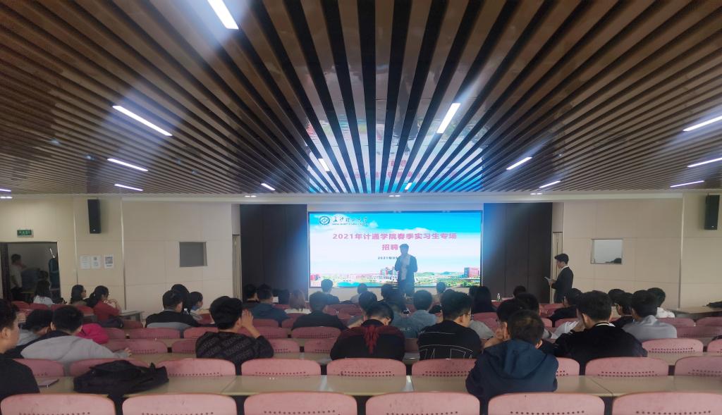 5月18日,计通学院在云塘校区工科三号楼A307开展了2021年春季第二场实习生专场招聘会,学院党委副书记涂道勇,辅导员郑国义、聂静,各企业代表和18级全体就业同学参与了此次实习生招聘会。