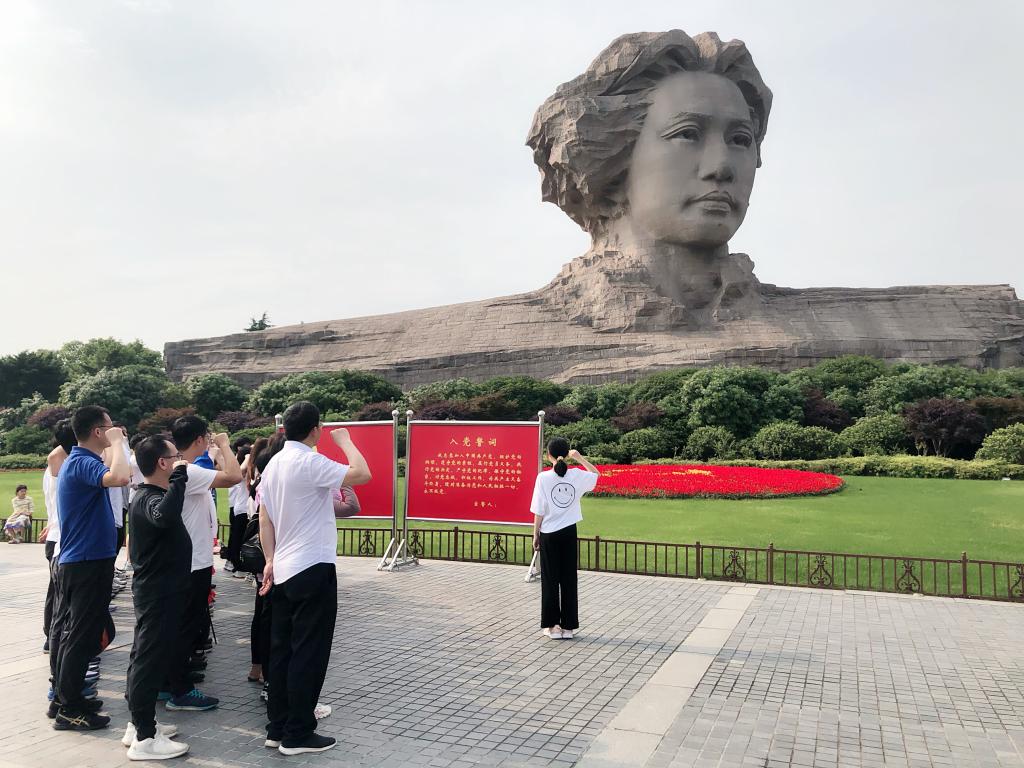 “我志愿加入中国共产党,拥护党的纲领,遵守党的章程,履行党员义务......”在毛泽东青年艺术雕像前,师生列队举握右手,在学生党员代表黎清蓉的领誓下,重温入党誓词。誓言铮铮嘹亮,气氛庄严肃穆。