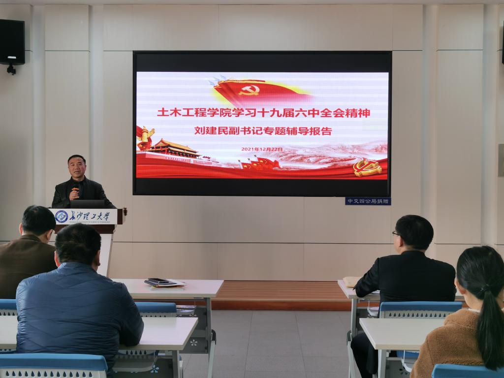 12月22日下午,校党委副书记刘建民在土木工程学院学生发展中心为学院师生宣讲十九届六中全会精神。学院党委班子成员,全体行政工作人员、教师代表及各党支部书记、支委80余人参加,会议由院党委书记江河主持。