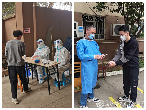3月27日,志愿者们来到金盆岭校区物业公司采集点。该采集点的主要服务对象是离退休教师,由于雨天台阶湿滑,为了保证安全,何纯芳紧急调度部署,在台阶铺设了防滑的硬纸板和麻布袋,张静老师和学生党员们撑着雨伞守在台阶两边,成为“守护小蓝”,搀扶护送每一位检测完毕的离退休教师安全离开,确保检测工作安全、有序。