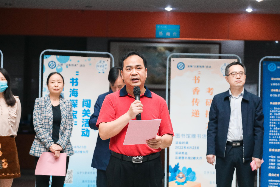 黄创霞致辞,他对图书馆举办的系列活动给予了高度肯定,他呼吁长理学子积极响应、踊跃参与,并鼓励大家享受阅读带来的快乐,爱读书、读好书、善读书,共同努力,打造“悦”读长理,建设书香校园。