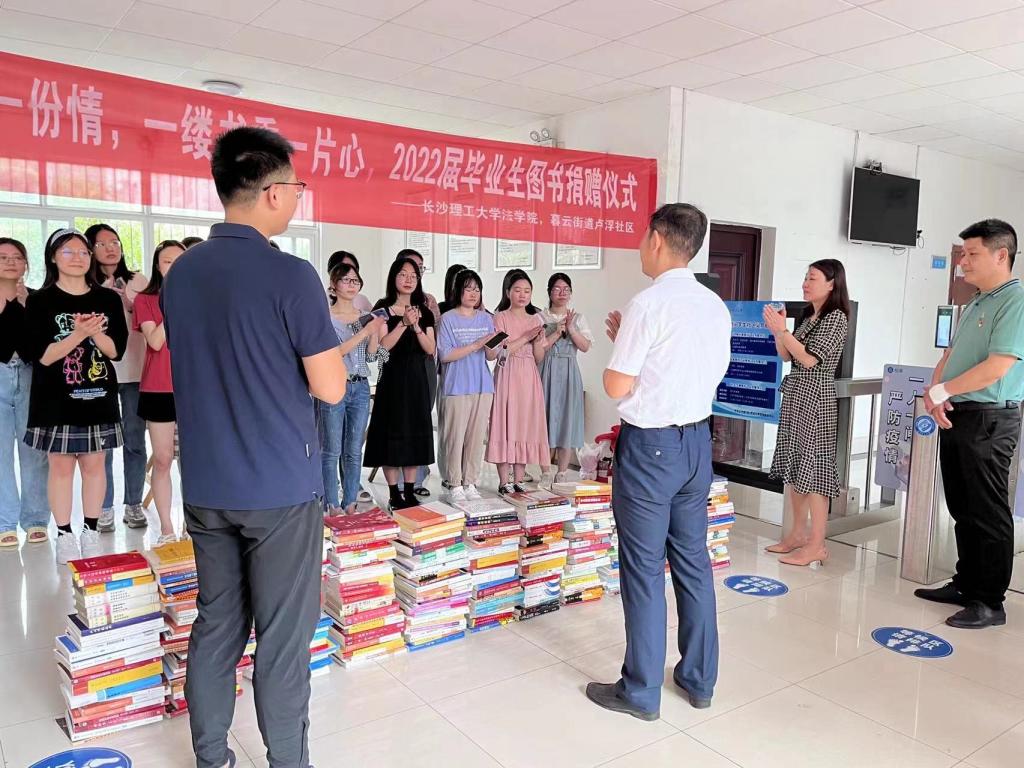 在学校就读期间,学院学生党支部的学生党员们多次与暮云街道卢浮社区开展党建共建活动,以法治宣传、禁毒反诈、文明实践等为主题,组建法治“青”骑兵,服务基层治理。在多次活动中,大家了解到社区正在筹建图书室,于是发动全体毕业生共同为社区图书馆捐赠书籍,助力书香社区建设。通过募捐,共筹集三百余本书籍。活动现场,学院党总支书记田兴洪与捐赠者代表共同将书籍移交给卢浮社区,社区党总支书记艾爱云代表社区接收书籍。