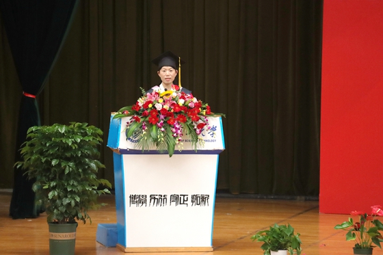 教师代表长沙理工大学经济与管理学院刘坚副教授祝贺2022届毕业生顺利完成大学学业。在临别之际,她寄语同学们把握奋斗的力量、梦想的力量、榜样的力量,希望大家常怀感恩心,相信相信的力量,终身学习,让青春在接续奋斗中绽放时代的光芒。