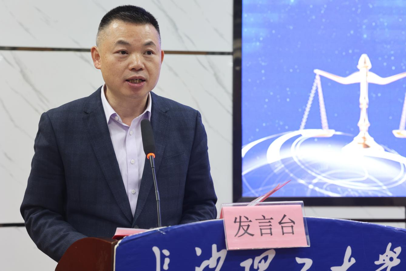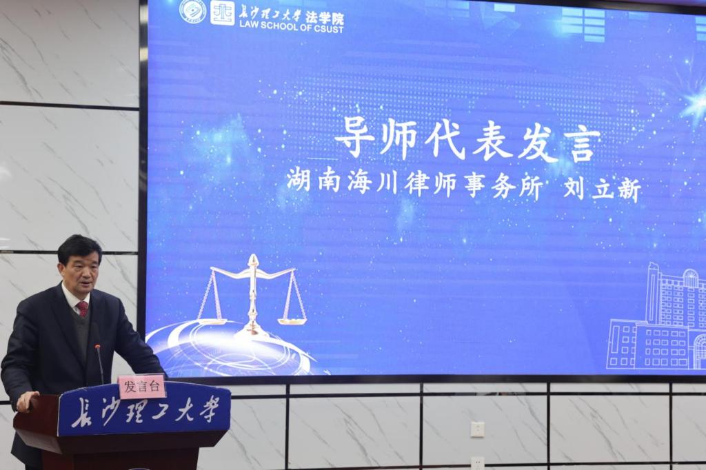 湖南海川律师事务所主任刘立新律师作为校外导师代表发言。他结合自身的职业发展经历,分享了法律之路的挑战与希望,并鼓励学生们要不忘初心、砥砺前行。他表示,担任兼职导师既是一份荣誉,也是一份责任,他将珍惜这一机会,充分发挥自身优势,为人才联合培养贡献自己的力量。
