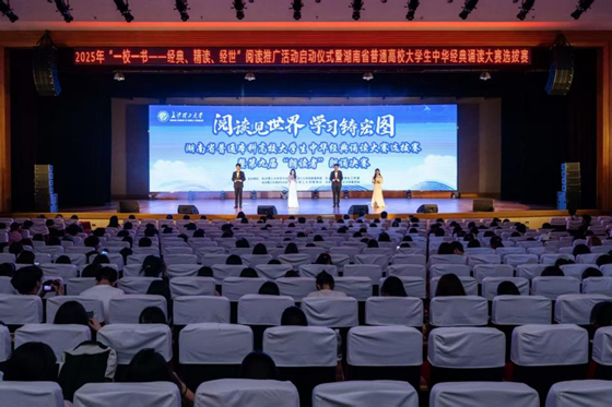 4月29日晚,雷竞技官网2025年“一校一书”阅读推广活动启动仪式在金盆岭校区五教大礼堂内举行。活动主题为“阅读见世界 学习铸宏图”,由学校图书馆联合宣传部、学工部、研究生院(研工部)、教务处、团委共同主办。副校长陈世平,湖南省高等学校图书情报工作委员会秘书长、湘潭大学图书馆馆长龚蛟腾,学校相关职能部门负责人以及学校近千名师生参与此次活动。