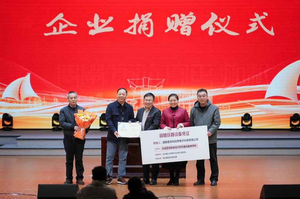 晚会中还举行了校友企业家捐赠仪式,郭贵雄与学校签订了书面捐赠协议,一次性向电网防灾减灾全国重点实验室无偿转让195万元设备使用权。张军辉向郭贵雄校友颁发了捐赠赠书,对郭贵雄校友感恩母校,回馈反哺母校的捐赠行为给予高度认可和评价,同时寄语全体新同学,希望大家以榜样为镜,博学而力行,在电气领域深耕不辍,夯实立身之本;要以时代为舟,守正而拓新,敢于探索前沿,勇于融合跨界;要以家国为怀,明德而致远,将个人理想融入国家需要,成长为有温度、有格局、有担当的时代新人。