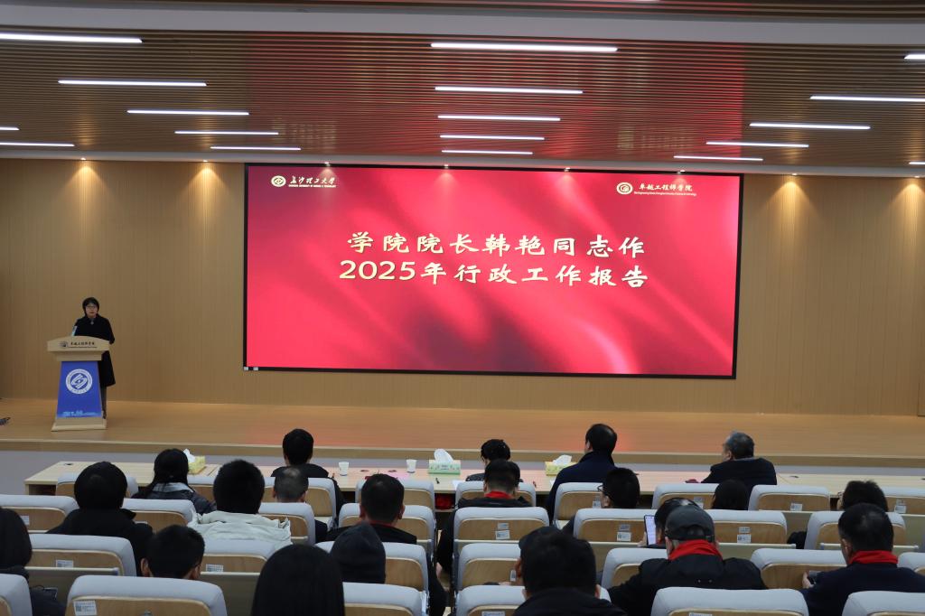 院长韩艳代表学院行政班子作题为《聚焦卓越育人,深化交叉创新,全面构建创新创业卓越人才培养新生态》的行政工作报告。报告系统回顾了学院2025年的工作成绩:服务保障全校实践教学任务高质高效完成,创业孵化与双创教育辐射效应不断增强,学科竞赛捷报频传;人才培养改革持续深化,项目制课程体系与科创平台建设成效显著,学生创新能力显著提升;学科建设取得关键突破,交叉学科成功备案,高水平师资队伍持续壮大,科研成果稳步增长;教学科研条件与育人环境得到系统性优化升级。报告同时明确了2026年的工作重点:聚焦深化教学改革、谋划本研一体化培养与交叉学科建设、推进工程训练中心提质改造等方面持续发力,奋力开创学院高质量发展新局面。
