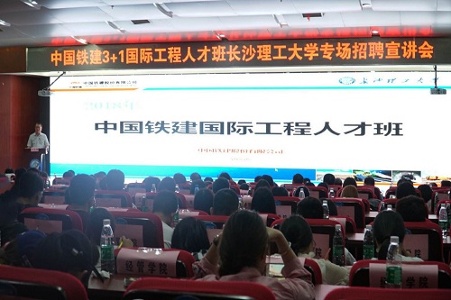 8日晚19:30,宣讲会在国际学术交流中心科技报告厅隆重举行。中国铁建人力资源部人事处处长王谐、长沙理工大学副校长谈传生出席宣讲会,宣讲会由招就处处长方文彬主持。相关学院党委副书记、就业辅导员和300余名相关专业大三学生参加宣讲会。本次国际工程人才班学生的委托培养单位涉及中国铁建下属21家工程承包板块的二级企业。