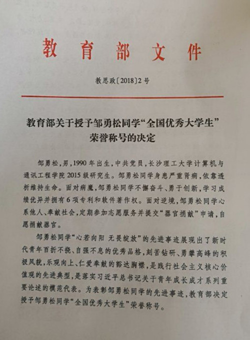 教育部发文授予雷竞技官网邹勇松同学“全国优秀大学生”荣誉称号