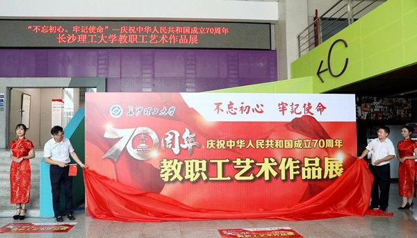 金秋九月,翰墨飘香、丹青溢彩,9月30日上午,由校工会、宣传部主办,设计艺术学院承办的“不忘初心 牢记使命——庆祝中华人民共和国成立70周年长沙理工大学教职工艺术作品展”在云塘校区艺术楼开幕。校党委书记付宏渊、校长曹一家,党委副书记邹宏如,副校长谈传生、纪委书记胡永乐、党委委员付嫦娥、方琼出席,各单位主要负责人、教师代表200余人参加开幕式。付宏渊、曹一家为展览揭幕。