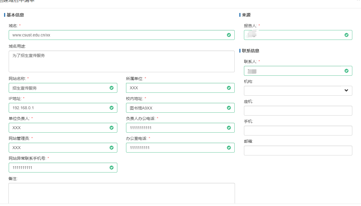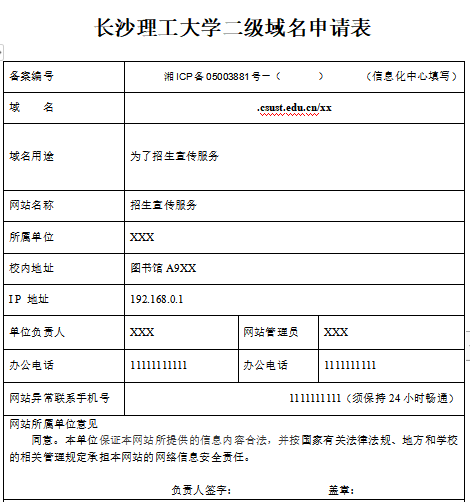 (1)此表只用于长沙理工大学.csust.edu.cn下的二级网站域名申请;