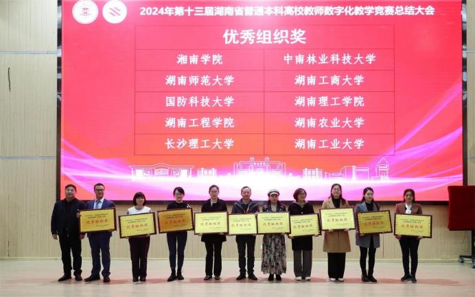 本次竞赛由湖南省教育厅主办,分文科组、理工组、实践组展开角逐,旨在全面提升普通本科高校教师的数字化教学水平和数字技术应用能力。比赛经过校级初赛、省级复赛的层层选拔,来自省内各高校的60个优秀教学团队晋级决赛。决赛现场抽取竞赛顺序和知识点,参赛教师须在12分钟内完成数字化课程建设、教学成效介绍和对随机抽取的教学内容进行课堂展示。