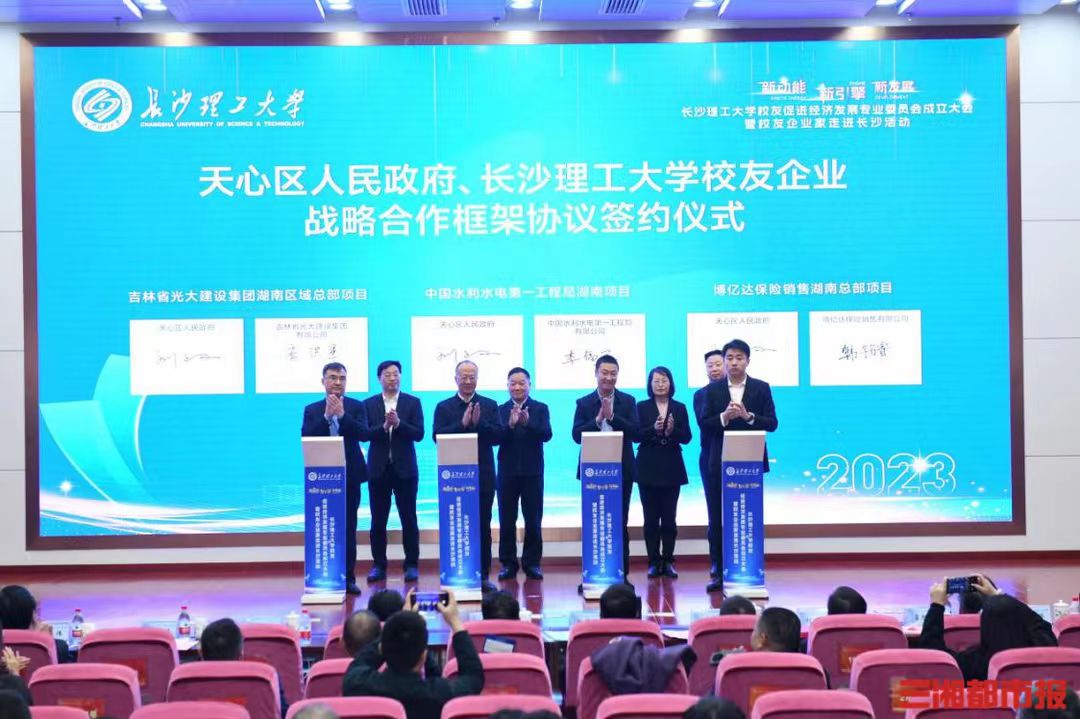 此外,大会宣读了长沙理工大学校友促进经济发展专业委员会成立文件,选举了组织机构成员,表决通过了相关管理办法,万里交科集团德通智能科技股份有限公司董事长张良奇担任校友促进经济发展专业委员会主任。长沙理工大学、天心区政府签订校地人才战略合作框架协议;中国水利水电第一工程局有限公司、吉林省光大建设集团有限公司及博亿达保险销售有限公司三家长理校友企业与天心区政府签订战略合作框架协议。