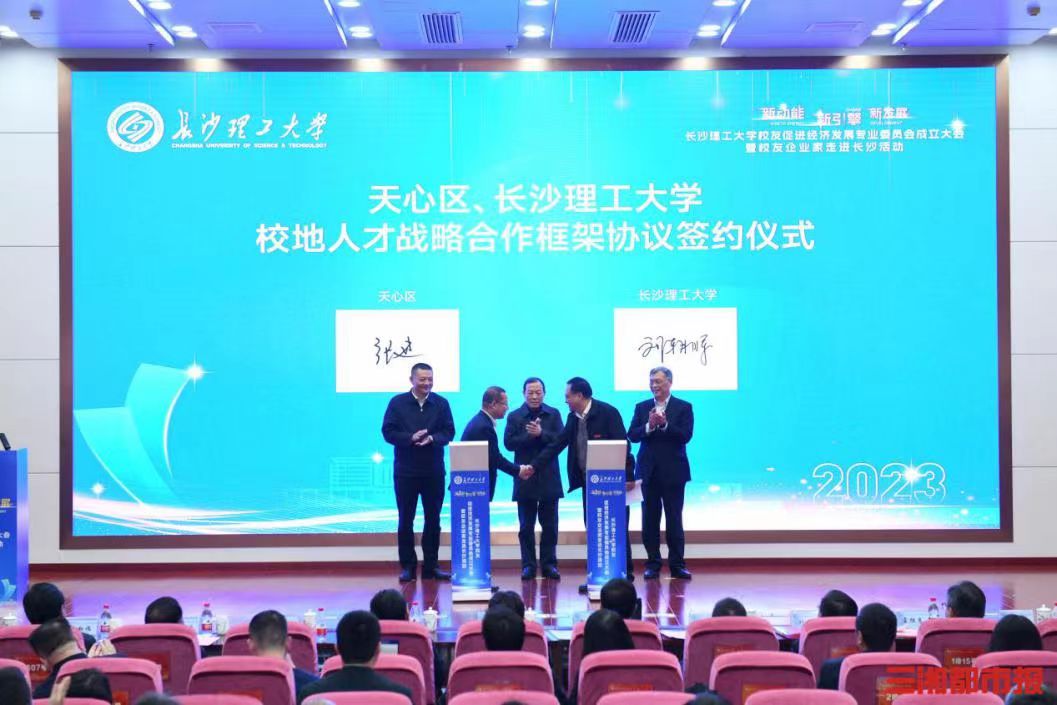 长沙理工大学科研优势与科技成果,88家校友企业成果展示……现场,长沙理工大学党委副书记刘建民表示,校友经济正成为推动城市和经济社会高质量发展的新引擎,也成为高校服务地方发展模式的新路径和重要延伸。他认为,校友是学校最珍视的力量,也是长理声音的重要传播者、长理故事的重要书写者、长理作为的重要担当者。刘建民希望校友和校友企业能在湖南、长沙和天心区发展的战略机遇中寻找和发现更多合作点,主动融入湖南“4+4科创工程”“八大工程”“七大计划”“九大行动”和基础设施“五张网”建设等,参与到“一江一湖四水”治理与开发、大数据产业、工程机械、电力装备产业、先进储能材料、食品工程等研发攻关;深度融入长沙全面建设全球研发中心城市、国家重要先进制造业中心、国际文化创意中心、国家综合交通枢纽城市等重大工程中;主动对接天心区“五个三”总体战略,进一步将爱校强校荣校情怀、行业优势、技术优势转化成地区发展优势。