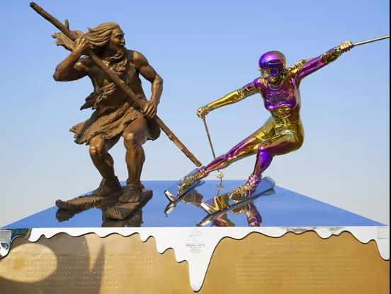 黄剑作品《万年之约》。一位是驰骋于中国北方茫茫雪原的狩猎者,一位是来自西方冬奥会的高山滑雪健将,他们穿越时空,邂逅于2022北京冬奥会滑雪赛场。