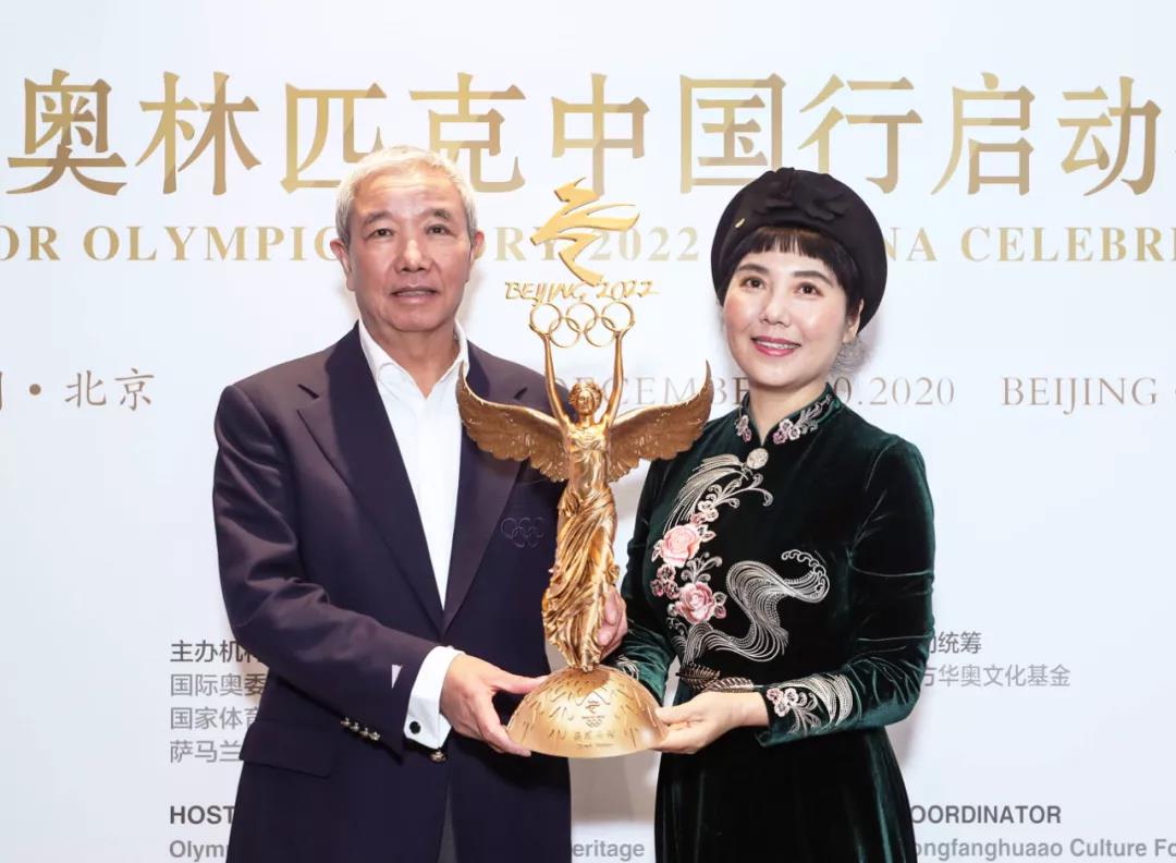 国际奥委会副主席、北京冬奥组委副主席于再清与“奥林匹克中国行宣传大使”黄剑共托“奥林匹克中国行”艺术标志《奥运女神》,开启“奥林匹克中国行”。