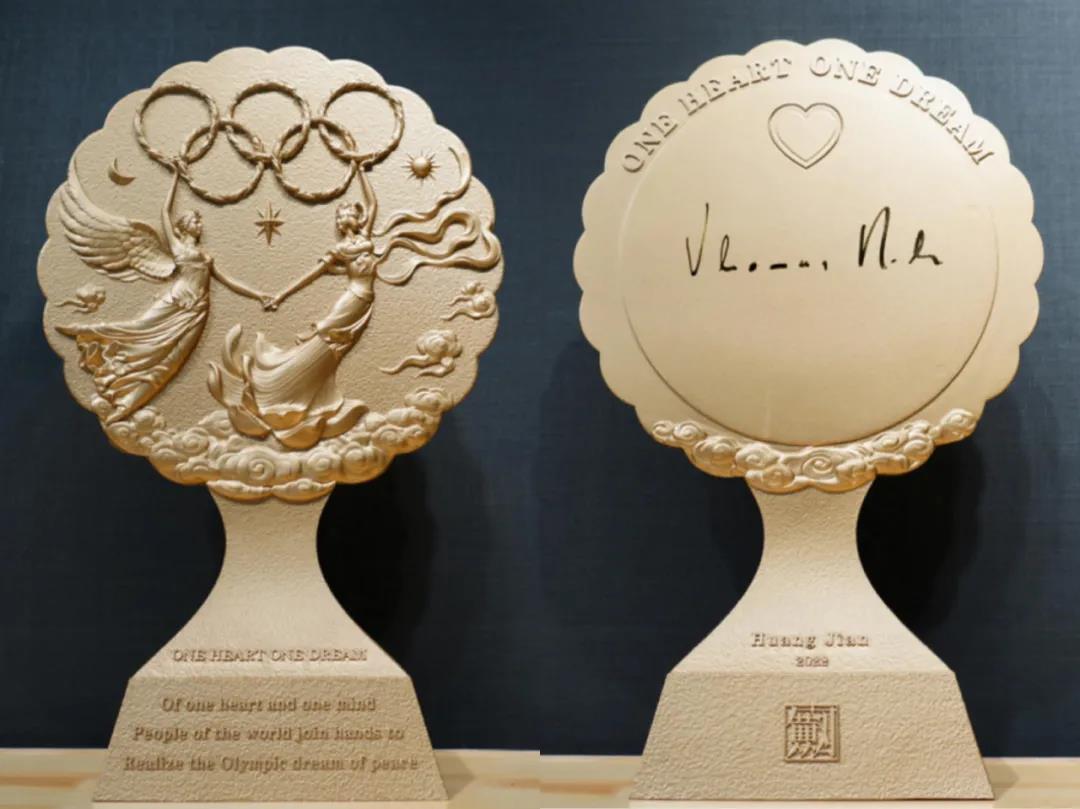 黄剑作品《同心圆梦》。奥运女神携手嫦娥月神奔向太空祝福奥运。东京奥运会之际,巴赫主席为该作品签字并委托国际奥委会发来感谢函:“衷心感谢黄剑女士对奥林匹克运动和艺术的支持与贡献。”