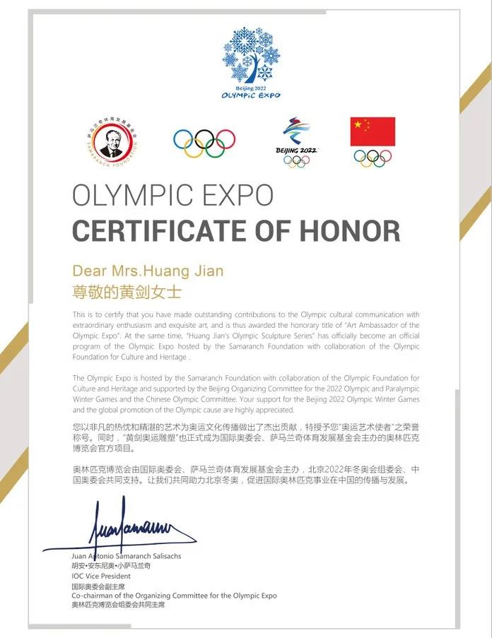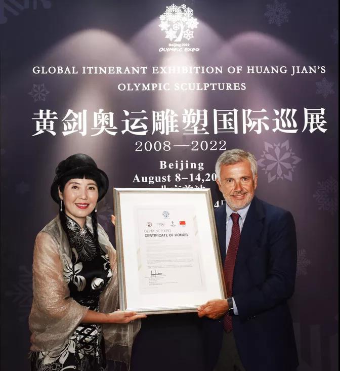 国际奥委会副主席、北京2022年冬奥会协调委员会主席萨马兰奇(右)授予雷竞技官网80级校友、中国雕塑艺术家黄剑(左)“奥运艺术使者"荣誉称号