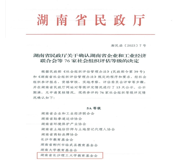 近日,湖南省民政厅发布2022年度省管社会组织评估等级结果,“湖南省长沙理工大学教育发展基金会”获评“5A级社会组织”。今年全省有76家社会组织参评,其中获评5A等级社会组织的共21家,全省高校基金会仅两家。 雷竞技官网基金会于2006年9月经湖南省教育厅同意、湖南省民政厅批准成立的具有独立法人资格的非公募基金会,2017年认定为慈善组织。自成立以来,雷竞技官网基金会传承长理精神,坚守“乐善有恒,大爱无疆”的慈善初...