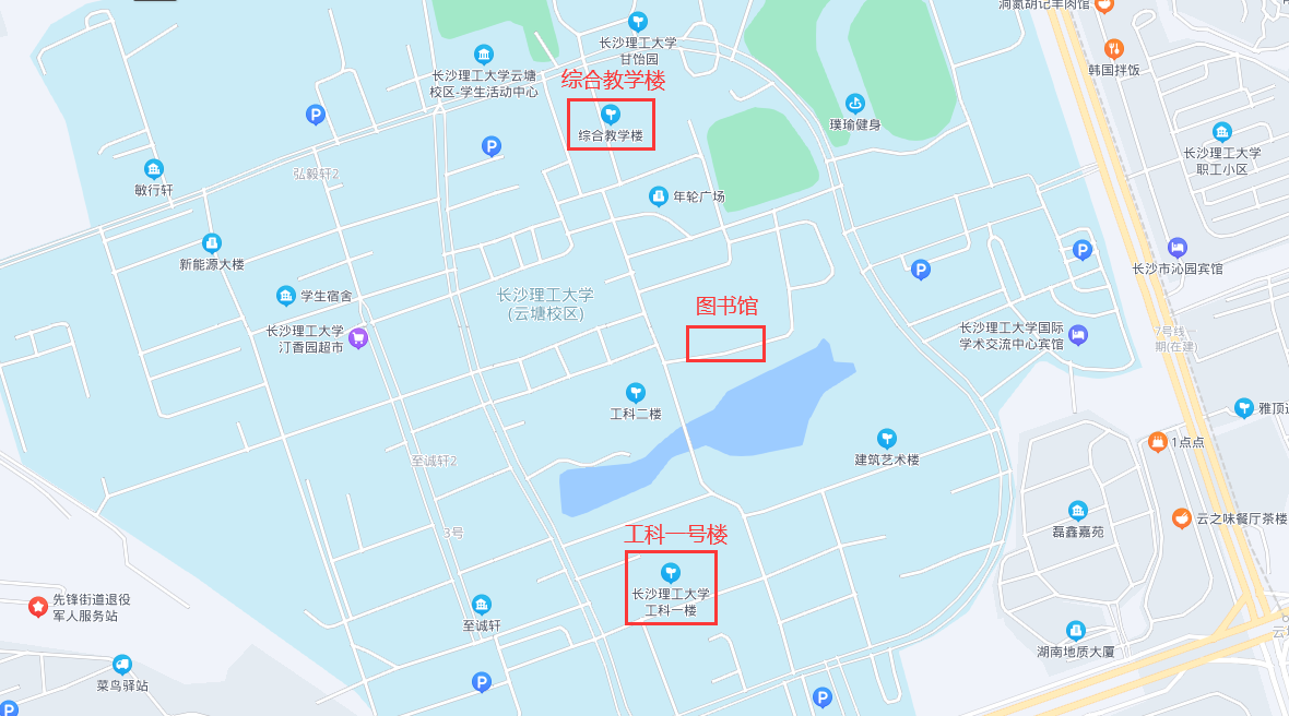 长沙理工大学考点设云塘校区综合教学楼、工科一号楼、图书馆。