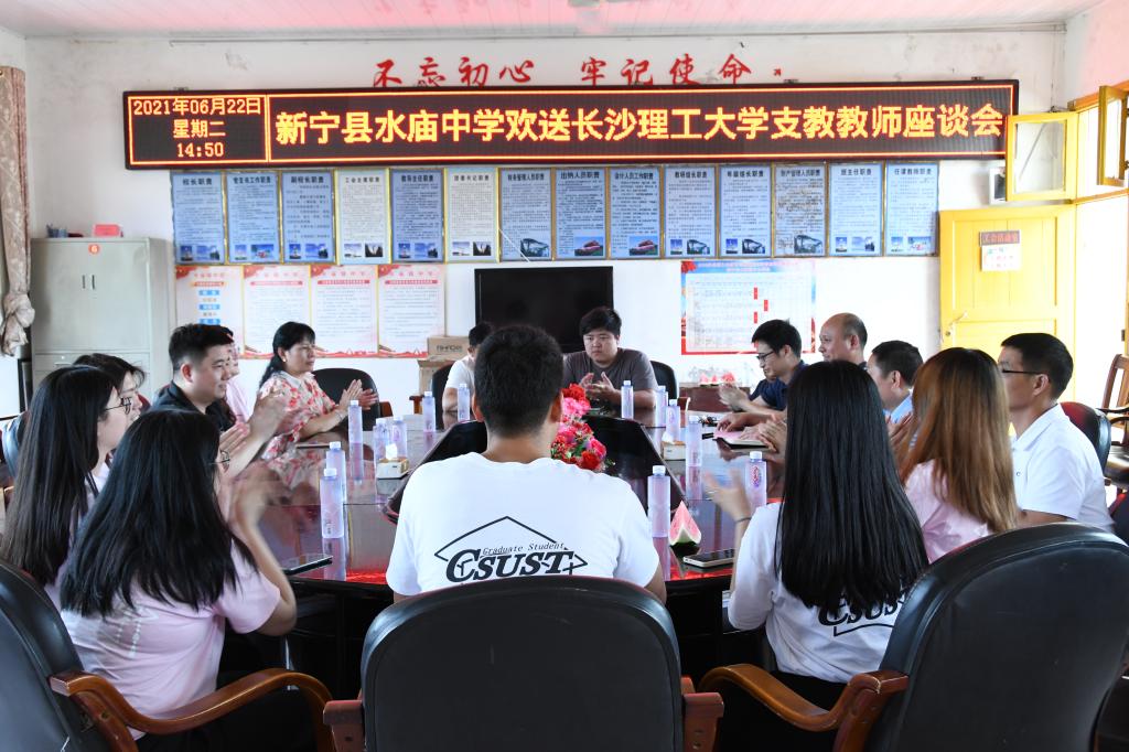 返程前,水庙镇政府在水庙中学会议室为长沙理工大学研究生志愿支教队举行了简单而诚挚的欢送座谈会,水庙镇党委副书记、镇长李小立,水庙镇联校校长陈小军,枧杆山村村支两委主要负责人,水庙中学学生代表,校研究生院副院长兼研工部部长田上及研究生志愿支教队全体队员参加了座谈。