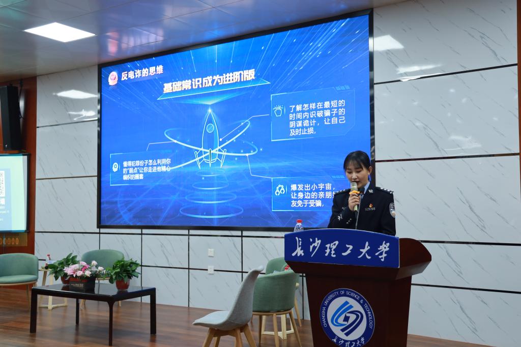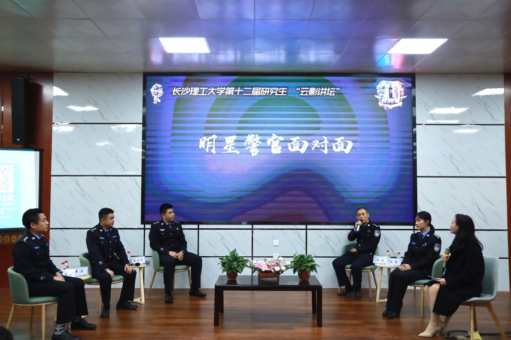 12月2日晚7点,长沙理工大学金盆岭校区四教报告厅内座无虚席,一场别开生面的普法活动正在热烈地进行中。应校研究生院邀请,热播视频《守护解放西》中的“明星警官”——张鹏、刘毅昇、刘星宇、易点、陈慧等一行专程来校出席第十二届研究生云影讲坛专题普法交流活动,200多名师生参加了现场活动,这也是该节目首场与高校学生的线下互动活动。