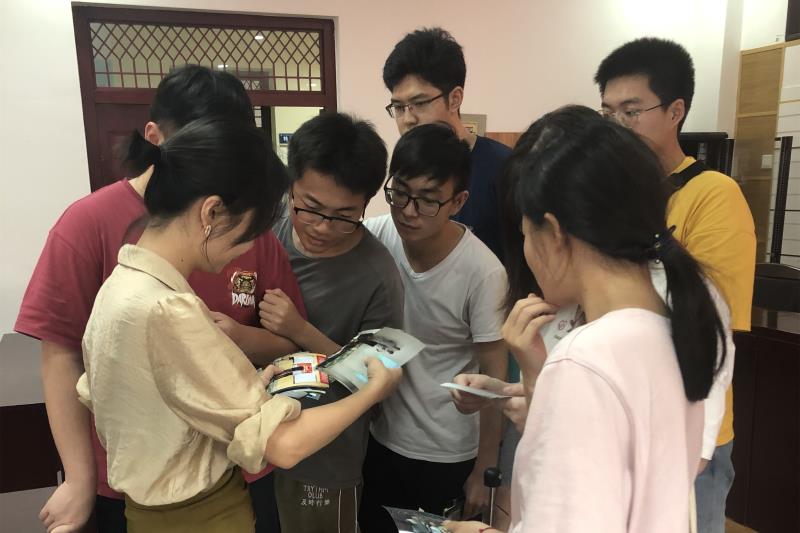 学生兴奋地观看照片