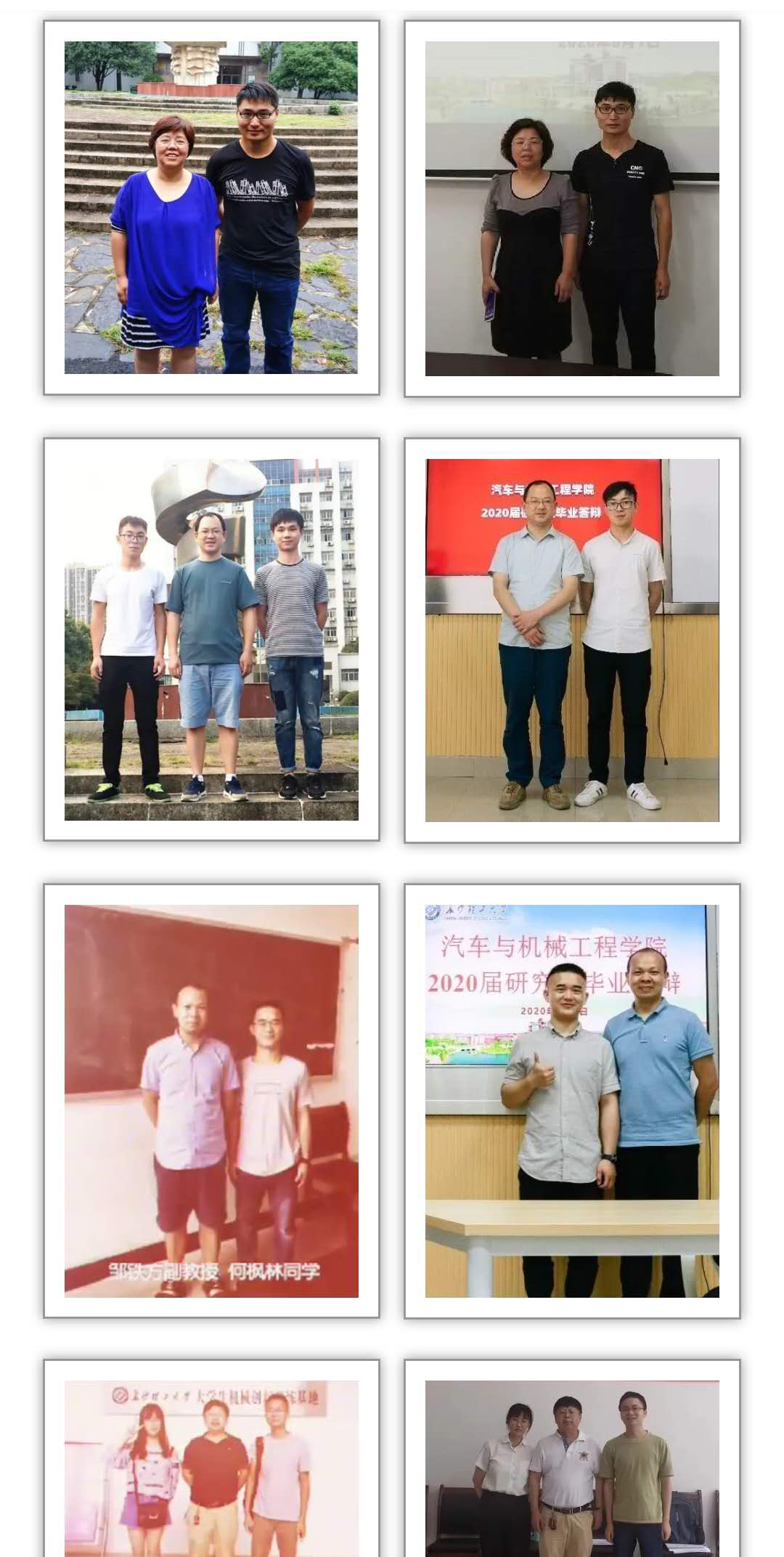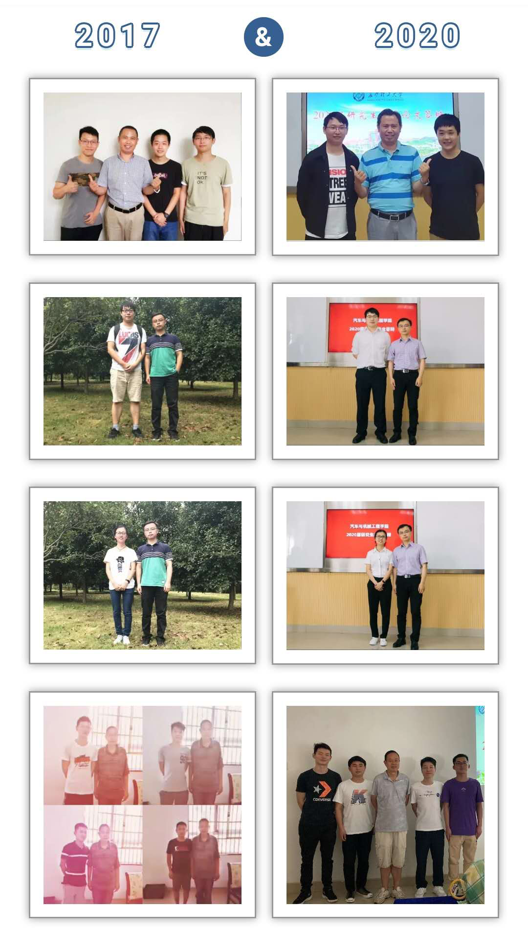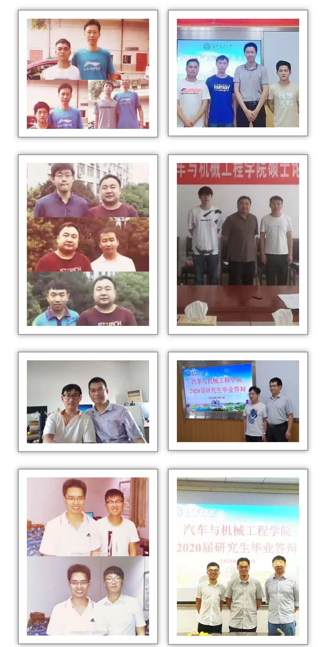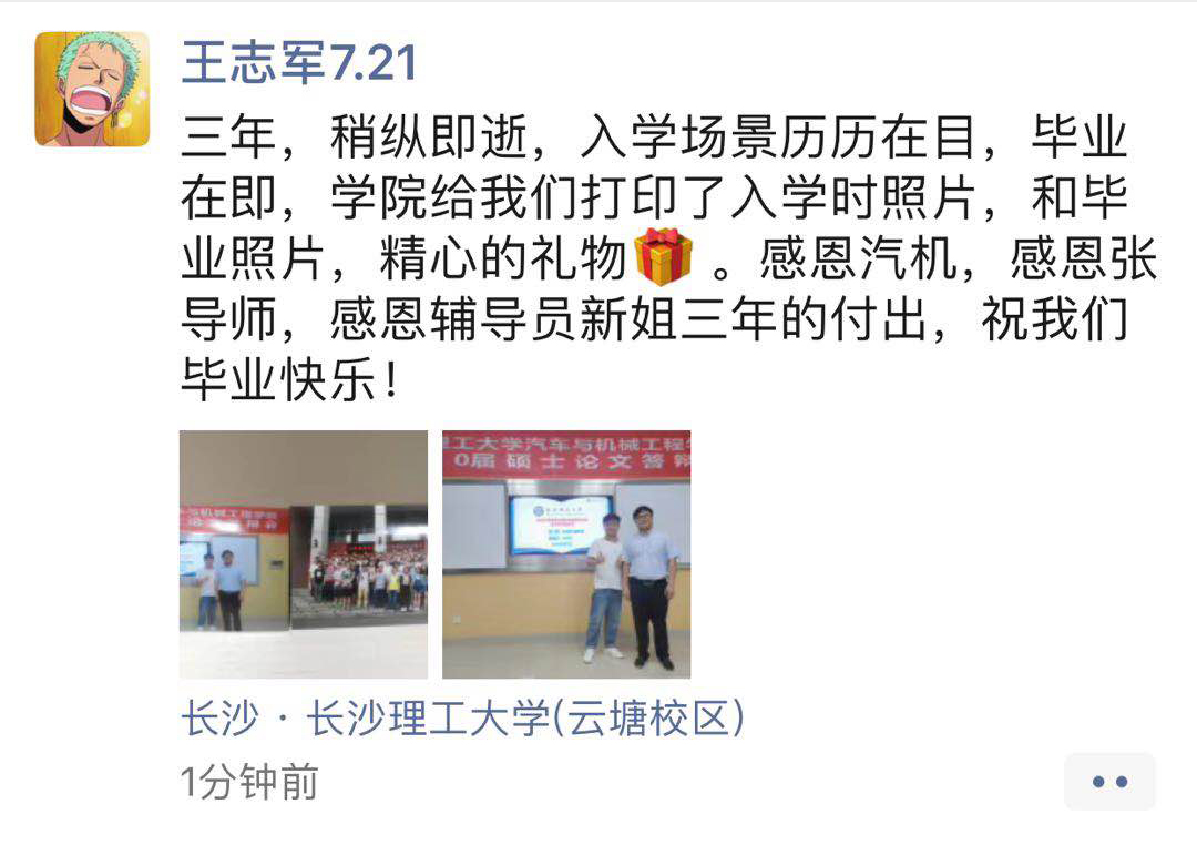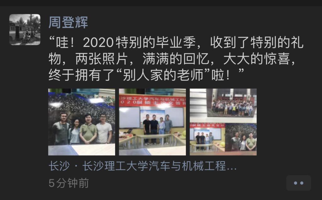 “哇!2020特别的毕业季,收到了特别的礼物,两张照片,满满的回忆,大大的惊喜,终于拥有了‘别人家的老师’”啦!”最近长沙理工大学汽机学院的研究生们纷纷在朋友圈晒出了自己的毕业礼物——“与导师的合影”。当然这不是普通的合影,而是一组让人倍感温暖的对比照,一张是2017年入学时与导师第一次见面的合影,另一张则是今年答辩结束时与导师的合影。