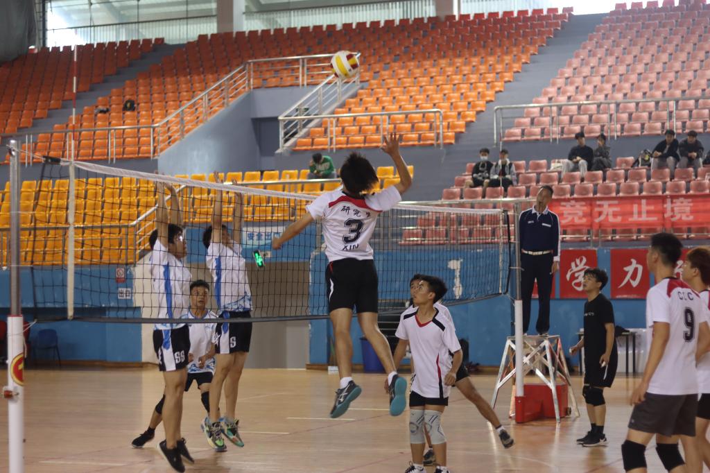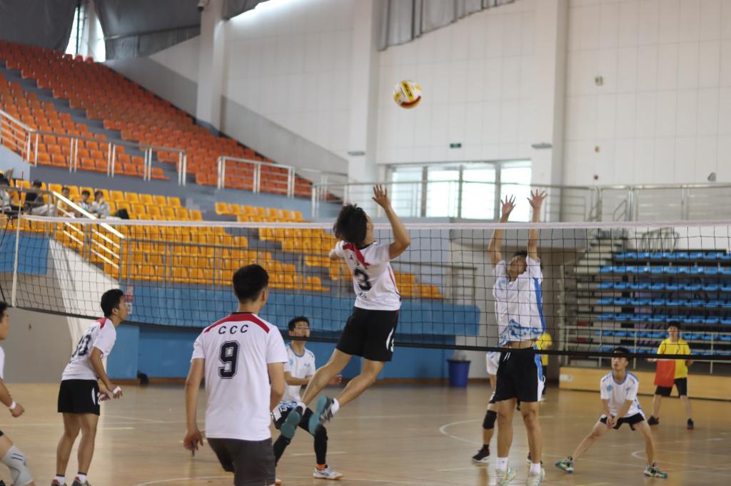 紧接着是更为激烈的男排决赛,这也是研究生男排组建以来首次打入决赛。在第一局比赛中,对于水利学院男排的短传快攻扣球,研究生男排的双手犹如铜墙铁壁,多次直接拦下,打的出其不意。比赛逐渐白热化,双方扣球的都能稳健接起,研究生男排一个小失误,导致触手接球打出界限,水利学院趁着气势拿下第一局比赛。研究生男排调整战术策略进行第二局比赛,打出了“奋力拼搏,火力全开”的劲力头。水利学院一个跳跃正手发球,研究生男排一传一个箭步接起,二传选手一个后仰传球,随后3号选手的扣杀姿势惊艳在场观众,他的手、腰板和双脚所展开的弧度犹如拉满的弓箭,“啪”闪电般的挥拍,球在空中似乎划出了火花一样,打到对方场地底线拿下一分,全场观众高呼呐喊,鼓声雷动。遗憾的是,第一次杀入决赛的研究生男排大赛经验不足,最终与冠军失之交臂,获得亚军。