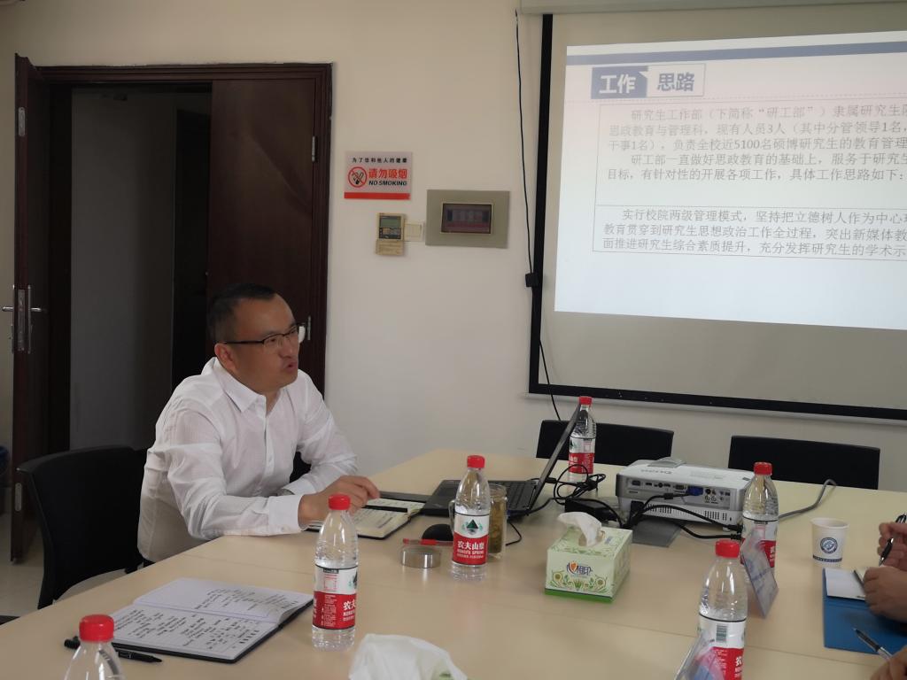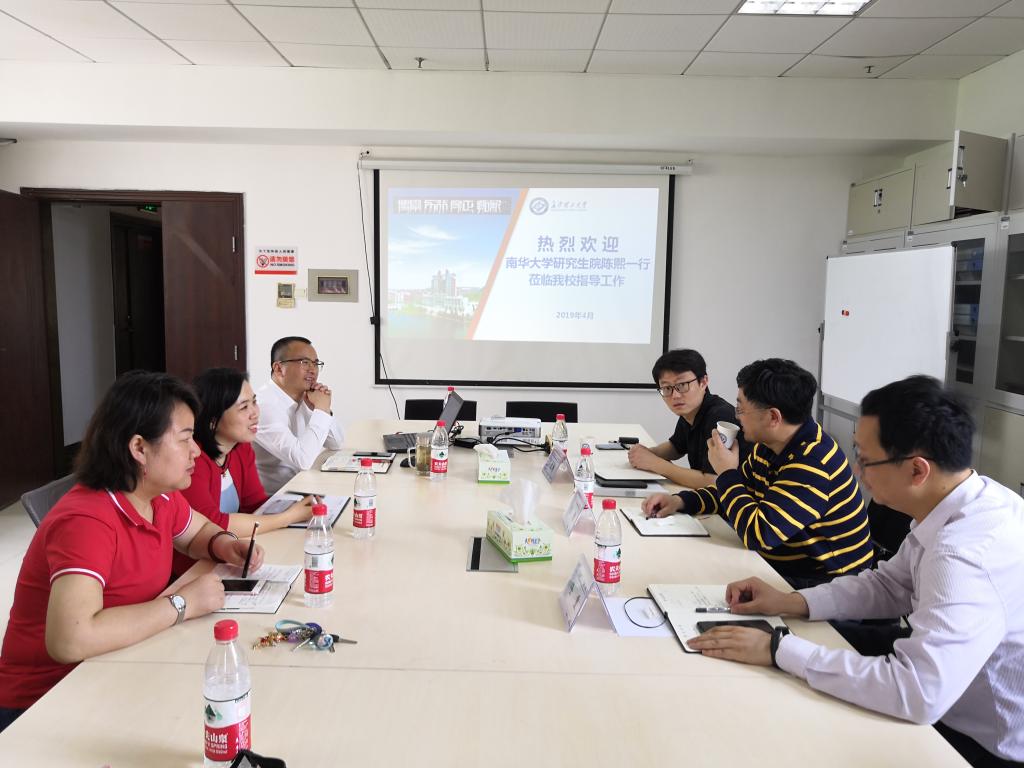 4月25日,南华大学党委研究生工作部部长陈熙一行三人来雷竞技官网交流研究生思政教育与管理工作。研究生院院长管德清、副院长兼研工部部长刘亚辉和相关人员在云塘校区热情接待客人,并进行座谈。