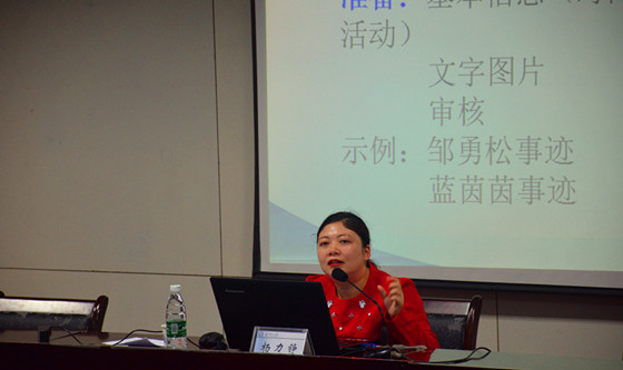 她强调,“你在媒体上展现的是什么样子,别人就会认为你的学校是什么样子。”在谈及“意识”时,她认为我们应培养宣传意识、策划意识和媒体意识,并通过“中国好人”邹勇松同学和“最美教师”蓝茵茵老师的宣传案例,向大家强调应该加强对宣传工作意义的认知,提高对宣传题材的敏锐性。随后,杨老师从“融媒体”的概念出发,对校园网、新闻网、微信、微博等平台进行了分析,指出“我们的宣传应该是全方位的”,宣传时应加强各类平台的联动。同时,她从要素把握、主题确立、照片拍摄与选取等方面讲解了新闻写作的重要方法。