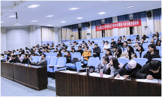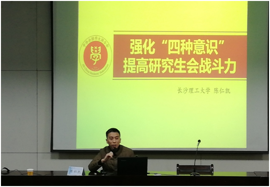 12月8日晚,长沙理工大学研究生干部作风建设与能力提升培训班第一课在金盆岭校区12教200开讲。外国语学院党委副书记兼副院长陈仁凯为研究生干部培训班作了题为“强化‘四个意识’,提高研究生会战斗力”的主题报告。研究生院副院长兼研工部部长刘亚辉,校研究生会全体成员以及各培养学院研究生会主要成员参加了学习。
