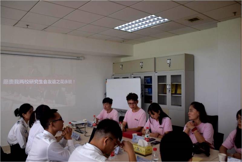 其次,两校研究生会代表分别介绍了研究生会工作开展情况。长沙理工大学研究生会主席易洲楠等从学校的发展历史、研究生会的基本情况、特色活动(两坛一节一实践)和新媒体运营机制及取得的阶段性成果等方面进行了介绍;东华大学研究生会副主席高强介绍了研究生会的工作基本概况,并系统介绍了东华大学研究生会的特色品牌活动,包括“百日读书”等学术活动,“街拍大赛”、“校园歌手大赛”等校园文化活动,展示了上海高校开放、包容的工作氛围。接下来,交流会进入了自由讨论环节。两校研究生会代表就新媒体平台的运营、校院两级管理模式、学生干部培养、研究生活动的项目化开展、外联赞助、品牌活动推广以及研究生会形象的树立等各方面进行了深度的交流和探讨,两校均在交流中收获了新启发。