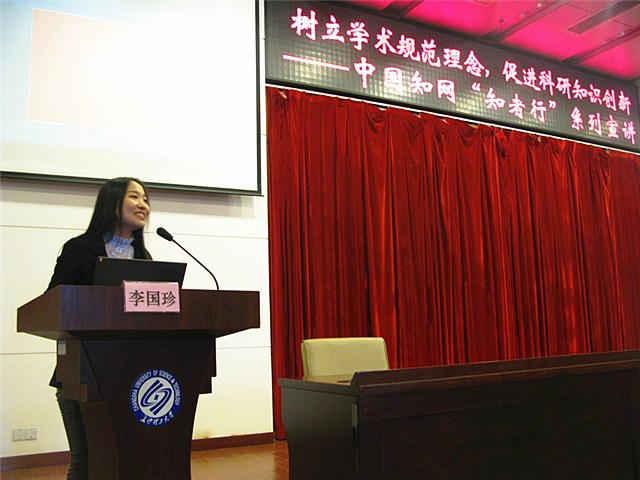 2月25日下午,中国知网“知者行”高校系列宣讲活动在雷竞技官网图书馆大报告厅举行。中国知网(CNKI)学位论文合作部编辑李国珍带来了题为“树立学术规范理念促进科研知识创新”的讲座。校党委委员、人文社科处处长杨鑫铨,研究生院院长管德清、副院长蒋菲,研究生导师代表、研究生教育管理工作人员和博、硕士研究生共300余人聆听了讲座。