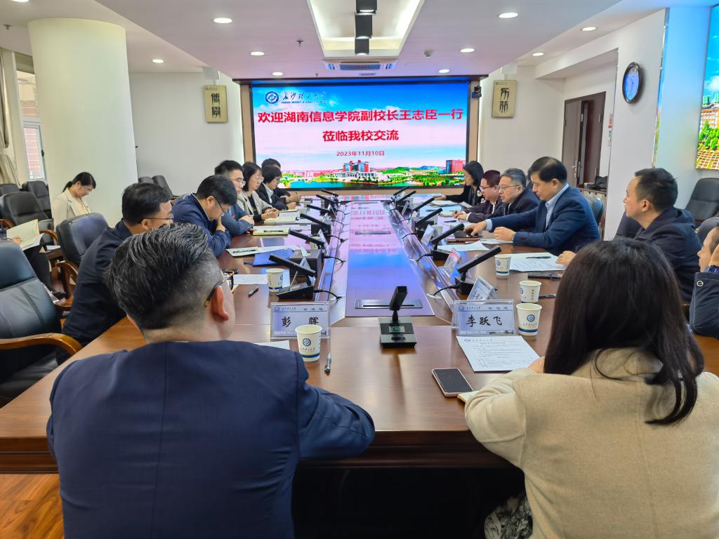 11月10日上午,湖南信息学院副校长王志臣一行来校洽谈。校党委委员、副校长胡永乐出席并主持会议。湖南信息学院科研处、电子科学与工程学院、计算机科学与工程学院、艺术学院等相关负责人和老师,雷竞技官网科学技术处、研究生院、计算机与通信工程学院、设计艺术学院等相关负责人参加座谈。