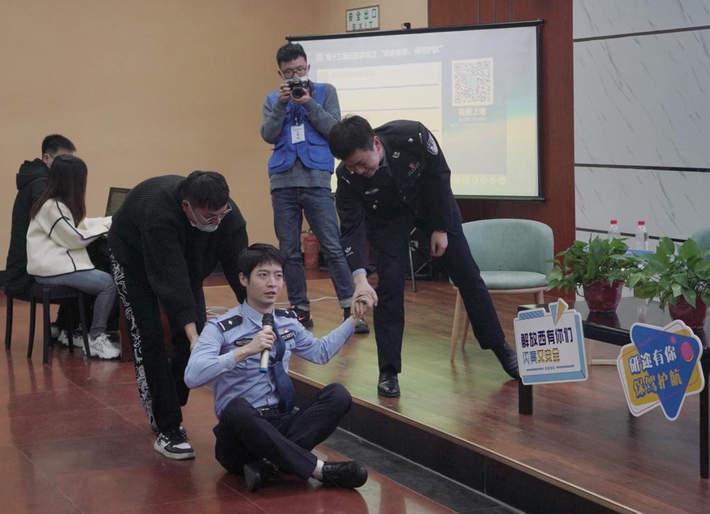 针对“如何应对家暴”“如何应对独居”“怎样树立正确的择偶观”等社会热点问题,警官们结合案例一一进行分析和讲解,一个个真实深刻的案例深深吸引着现场师生。最后在大家期待已久的情景模拟环节,现场观众与警官一起演绎了实战情景。警官扮演受害者,观众扮演歹徒,警官现场传授防身经验,观众们聚精会神,记录重点……大家纷纷表示,在和警官互动中收获了很多法律小知识,对现实危险情况也有了更加深刻的思考和共鸣。