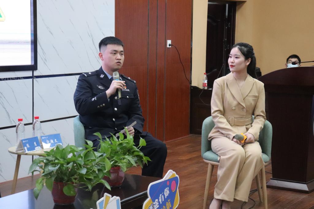 在互动访谈环节,现场观众积极提问,4位警官针对大家的提问给出了具体的建议和提醒。陈慧警官分享了关于“如何更好的处理亲子关系”的真实案例,给现场同学以积极向上的引导,倡导同学们勇敢乐观的面对人生以及树立正确的三观。涂瀚文警官则针对醉酒案例和打架案例,提醒大家珍惜生命,保障自己人身安全。欧阳睿乙警官结合平时处理的交通案件,指出校园电瓶车行车道路注意事项,并提醒同学们在使用电动车时要注意生命安全,财产安全和用电安全。齐翔宇警官结合毕业后的规划问题告诫同学们要早日规划好自己的方向,坚持梦想。现场观众反响热烈,呼声很高。