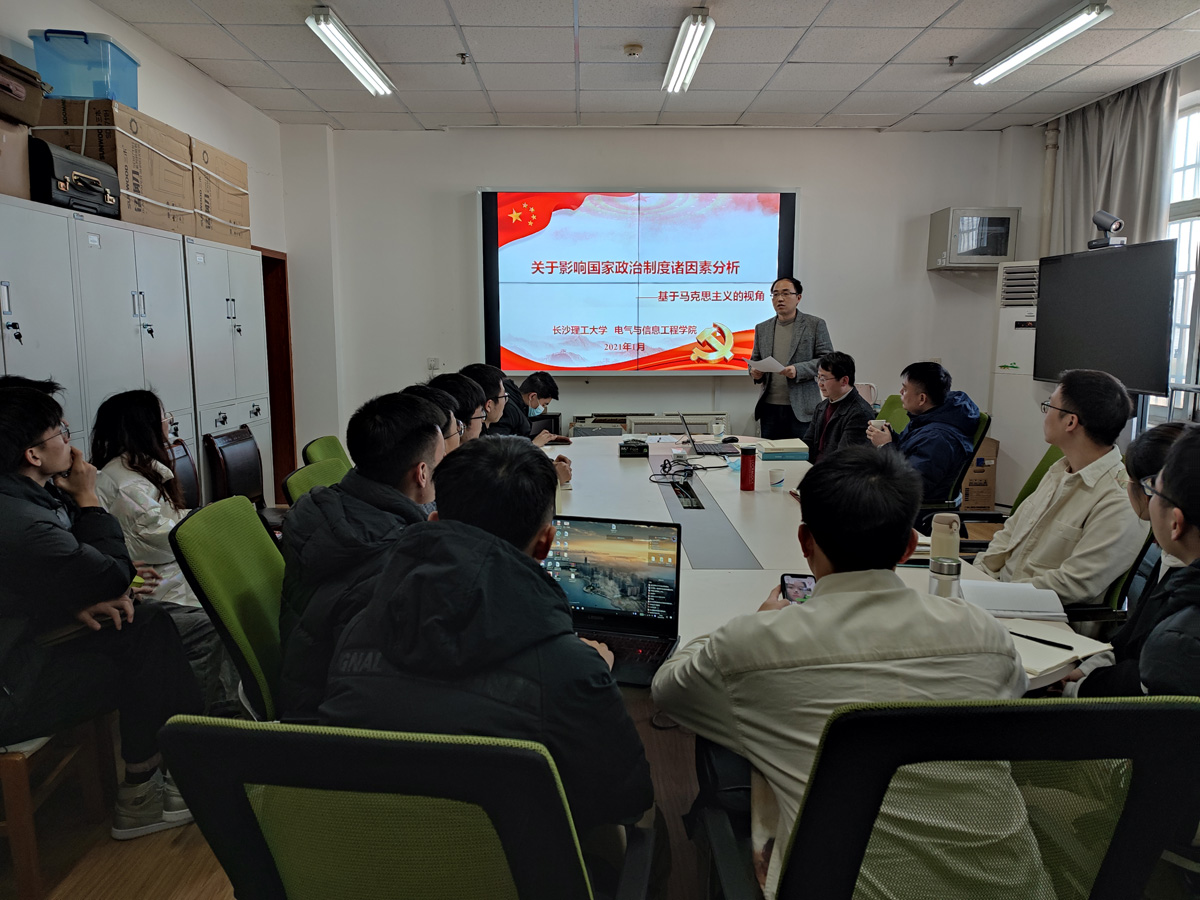 1月18日下午,一场热烈的讨论会正在电苑楼11-08实验室里展开,这是长沙理工大学电气与信息工程学院研究生课题组组织的“关于影响国家政治制度诸因素分析”思政专题学习研讨会。研讨会由课题组负责人,电气与信息工程学院姜飞副教授主持,该院32名研究生参加了讨论。本期特别邀请湖南大学电气与信息工程学院涂春鸣教授、马克思主义学院王学明博士与学生们共同探讨、并答疑解惑,