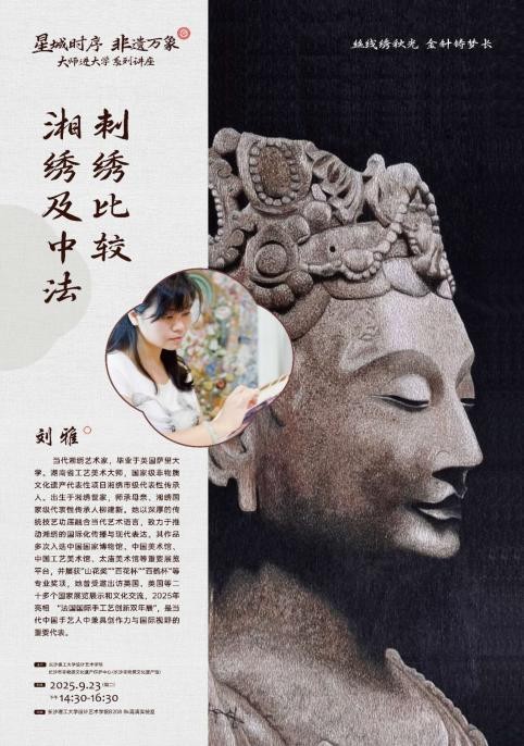 2025年9月23日下午,长沙理工大学设计艺术学院联合长沙市非物质文化遗产保护中心共同举办“星城时序 非遗万象”大师进大学系列活动,活动以“丝线绣秋光 金针铸梦长”为主题,特邀当代湘绣艺术家刘雅老师,与师生分享湘绣艺术的传承与创新之路。