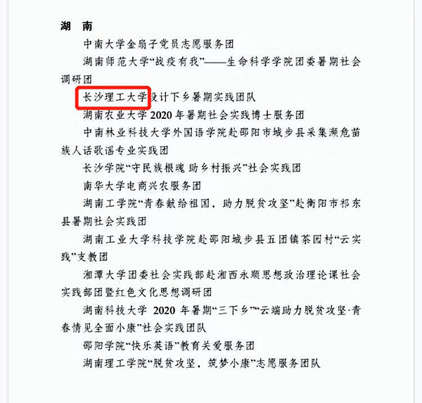 10月28日,中国青年报通过官方微信公众平台公布了2020年全国大中专学生“三下乡”社会实践活动优秀单位团队名单,长沙理工大学“设计下乡” 实践团荣获全国暑期优秀团队称号。