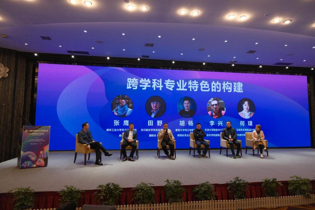 院长王健教授、副院长刘卫东教授主持了接下来的学术论坛和圆桌对话,来自各地各院校的专术家们针对数字媒体艺发展分享学术观点,围绕ChatGPT、数字人、元宇宙等热点议题开展主题演讲。在跨学科专业特色的构建、数字创艺服务区域经济建设、教师科研与实践成果认定与奖励方法、产教融合经验等主题的热烈讨论中,“数字化创新要协调多主体价值共创”“做好科研的三大关键是组建团队、成果积累冲奖项和结合学校优势学科”“要打开青年教师科研认定通道”等观点激发了与会老师的共鸣……