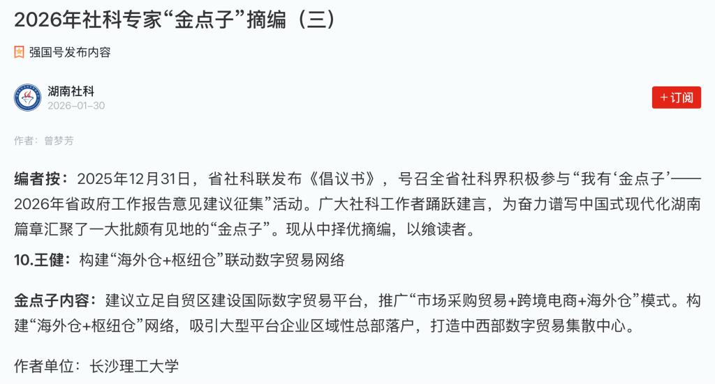 王健教授建议立足自贸区建设,打造国际数字贸易平台,大力推广“市场采购贸易+跨境电商+海外仓”的发展模式,构建“海外仓+枢纽仓”联动的数字贸易网络,积极吸引大型平台企业在湘设立区域性总部,着力打造中西部数字贸易集散中心。这一建议旨在推动湖南在开放型经济和数字贸易领域抢占先机,为提升内陆开放能级、做强外向型经济提供了重要思路。