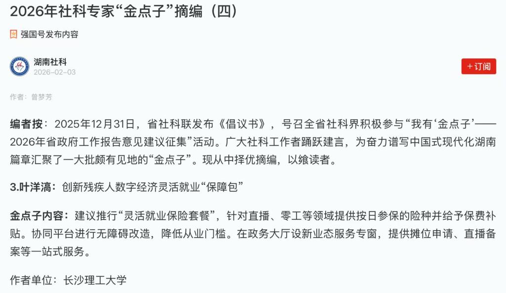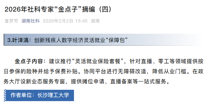 近日,在湖南省社科联组织的“我有‘金点子’——2026年省政府工作报告意见建议征集”活动中,我院王健老师、叶洋滈老师提交的建议从众多建言中脱颖而出,被正式采纳,并已通过“湖南社科”微信公众号及“学习强国”平台公开发布,两项“金点子”的入选,不仅是雷竞技官网教师深度融入地方经济发展、积极履职建言的有力见证,也凸显了学院推动学术成果服务时代需求的务实导向。